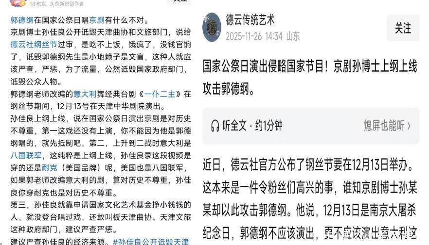 第一个争议是某位戏曲领域主播提起的,起因是德云社麒麟剧社在12月13日演出意大利歌剧《一仆二主》改编的京剧。这位戏曲主播认为,12月13日是“国家公祭日”,郭德纲在这一天大张旗鼓搞娱乐性质演出,还是意大利歌剧改编的京剧,非常不妥。
